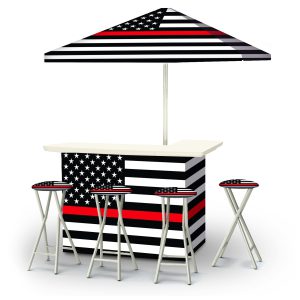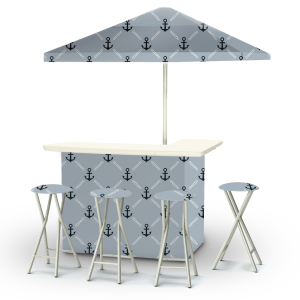The Best of Times Umbrella is a square market umbrella is that 6 feet wide on each side and is also made of commercial-grade white powder-coated steel. It stands 8 feet tall and the pole is a standard 1.5 inches in diameter. It easily breaks down into three parts for easy storage within the same deluxe wheeled travel case as the rest of the bar components. The fabric umbrella cover is digitally printed and is quick to assemble. Simply center it over the top of the umbrella frame and then extend each of the four arms out into corner pockets to make it secure. The umbrella has flaps at the top for increased wind-resistance and has a 35 mph wind rating. You also have the option of a Palapa (faux grass) umbrella cover as well, that is completely interchangeable with the fabric umbrella cover – both can be used with the same steel frame!