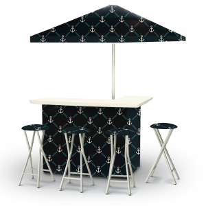 | Fabric Wrap(s) Included | One digitally printed fabric design that “wraps” around the bar and adheres with Velcro that is already attached. | One digitally printed fabric cover that is centered over the frame and then each of the four arms extend out to their corner pocket for a tight fit. | Four digitally printed fabric seat covers that simply slip over the tan padded seat of each stool for a snug fit. | – | – | – |