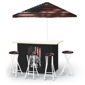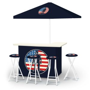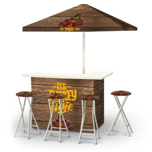 The Best of Times Umbrella is a square market umbrella is that 6 feet wide on each side and is also made of commercial-grade white powder-coated steel. It stands 8 feet tall and the pole is a standard 1.5 inches in diameter. It easily breaks down into three parts for easy storage within the same deluxe wheeled travel case as the rest of the bar components. The fabric umbrella cover is digitally printed and is quick to assemble. Simply center it over the top of the umbrella frame and then extend each of the four arms out into corner pockets to make it secure. The umbrella has flaps at the top for increased wind-resistance and has a 35 mph wind rating. You also have the option of a Palapa (faux grass) umbrella cover as well, that is completely interchangeable with the fabric umbrella cover – both can be used with the same steel frame!