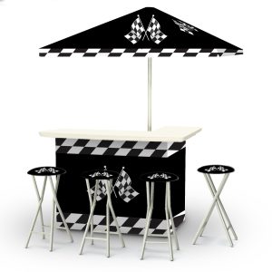 Product DescriptionL-Shaped Bar with 3 levels of blow-mold plastic shelves and a covered cooler insert.Square Market Umbrella with standard 1.5″ diameter pole. Base not included.Set of (4) Bar Stools that are standard 30″ high. Has tan padded seats.Travel Bag features plastic bottom insert, sturdy wheels and carry handle.Food-Grade. Insulated. Custom fit for the inside middle shelf.Has an adjustable shoulder strap. (Stool bag included only when purchased directly from our website)